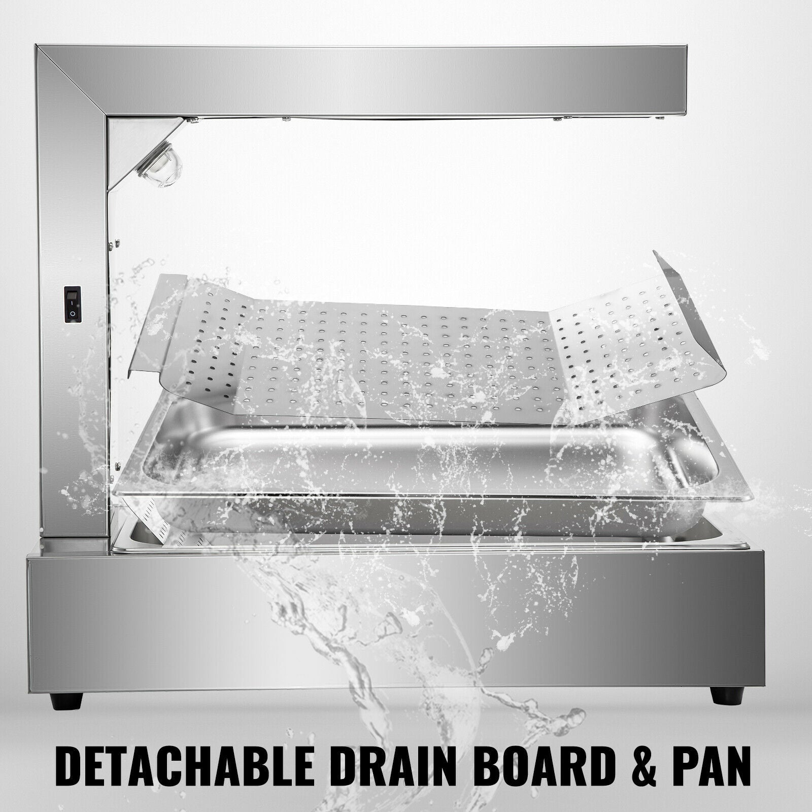 - WASHABLE DRAINBOARD & DRIP PAN - The base of the food heat lamp warmer holds a food-grade stainless steel food pan, 20.7"x12.8"x2.6" (525x325x65 mm) in dimensions, including a bent perforated drainboard for excess grease drainage. They are all detachable for convenient cleaning.