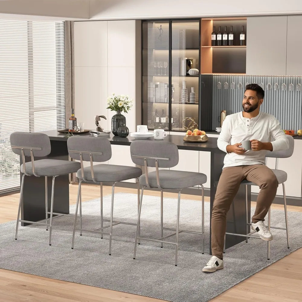 Upgrade your kitchen or dining space with this Fabric Counter Bar Stools with Back and Metal Legs Footrest Set of 4 from Kitchen Groups, featuring a comfortable fabric seat and supportive backrest. The sturdy metal legs with built-in footrest ensure stability, making these stools perfect for kitchen islands, breakfast counters, or home bars.