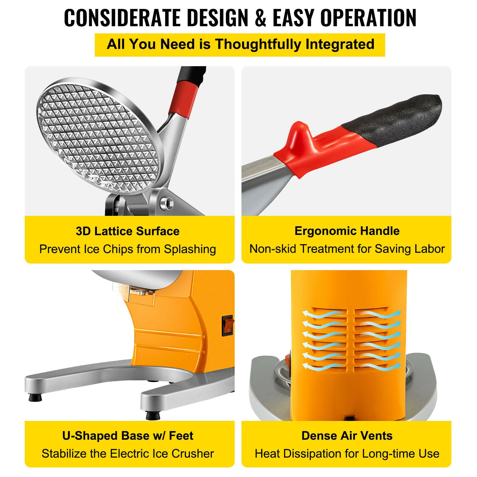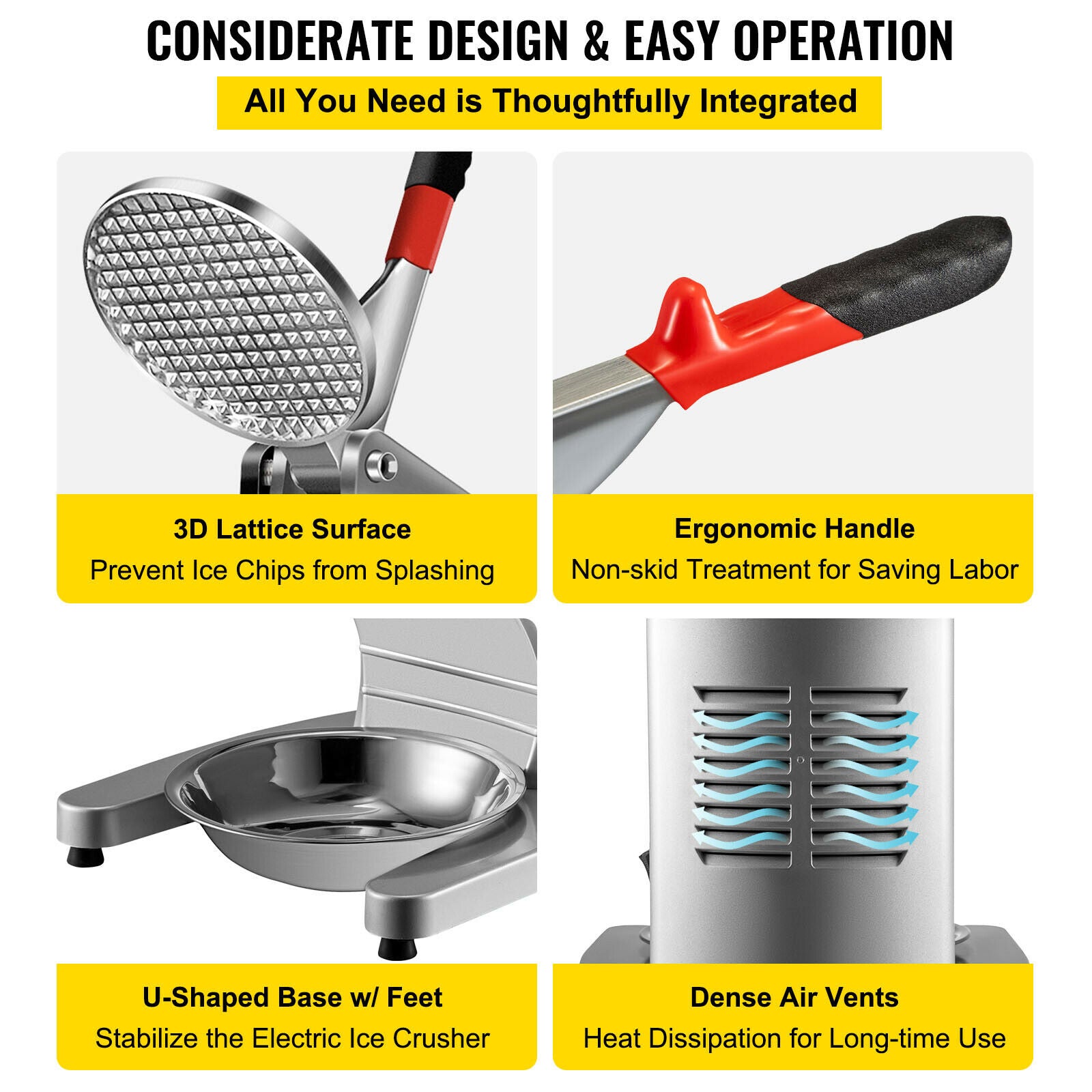 DETAILS FOR COMFORTABLE USE - Considerate details are integrated on our snow cone machine. The disc perfectly fits the ice inlet barrel, and its 3D lattice treated surface increases the contact area and avoids splashing. The ergonomic handle with a non-skid sleeve wrapped on its back end can facilitate effortless operation. The U-shaped base & rubber feet are also adopted to stabilize the machine. And the air vents can accelerate the heat dissipation, prolonging the motor's service life.