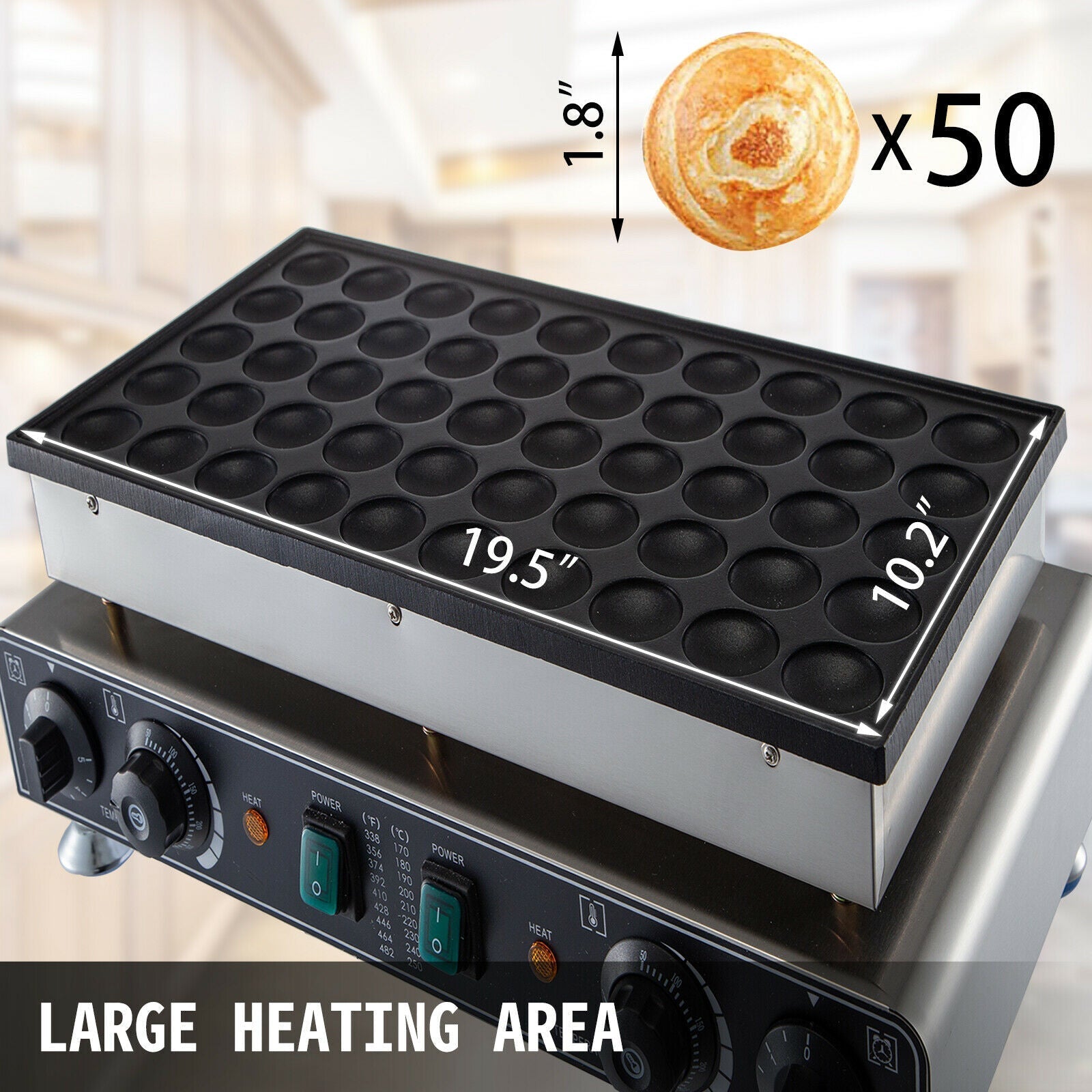 - HIGH EFFICIENCY - The highly conductive cast-iron plate distributes heat evenly to provide golden crispy poffertjes, with a large baking area of 19.5"x 10.2". Baking up to 50 Dutch pancakes (φ1.8"x0.4") at once will only take you 3-5 minutes.