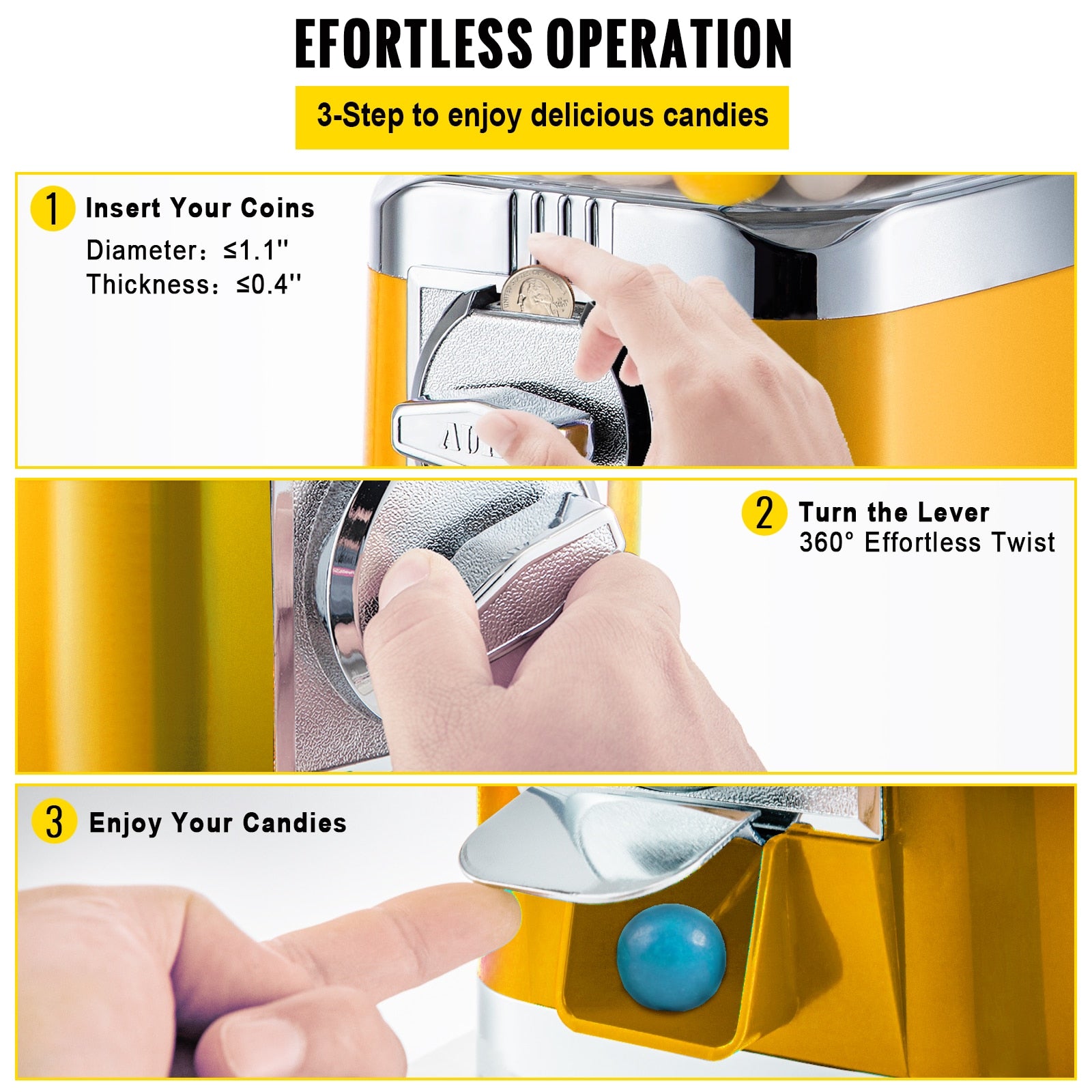 3-Step Effortless OperationIt won’t take you so much time to operate our candy dispenser. All you need is to adopt the 3-step procedure: insert the coins, turn the lever, and enjoy yourself.