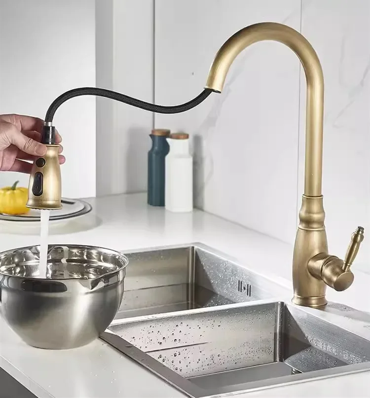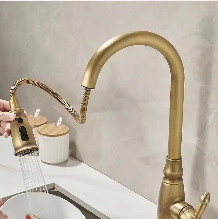 Pull-Out Rotating Spout Water Mixer Tap Antique Brass Kitchen Faucet