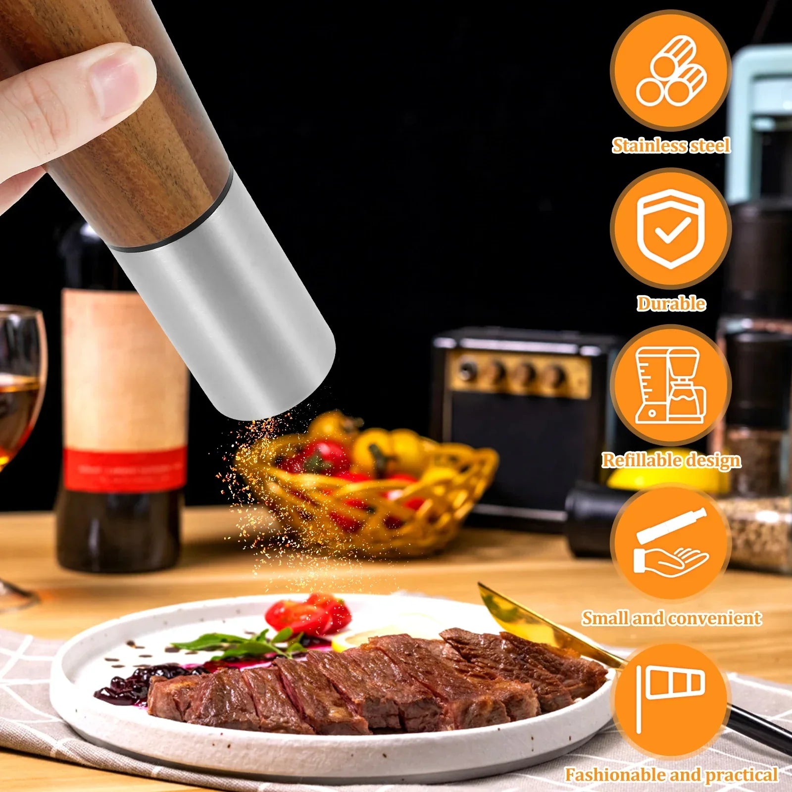 - Acacia Wood and With Tray: This salt shaker and pepper grinder set is made of solid acacia wood wood and it comes with a tray, adding a touch of elegance to your dining table or kitchen countertop.