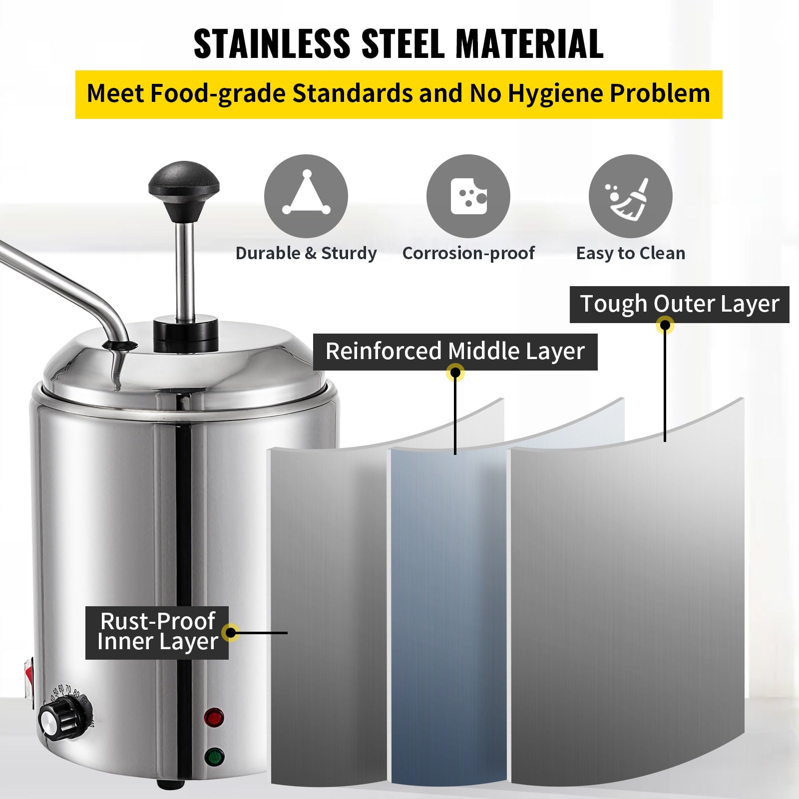 - Food-grade Stainless Steel: All the parts touched with food are made of food-grade stainless steel that is anti-rust, anti-corrosion, and easy to clean. The thickened body also makes the hot fudge warmer durable and not easy to deform. Get ready to create sweet chocolate fudge at a quality that will have friends, family, or customers, begging for seconds.